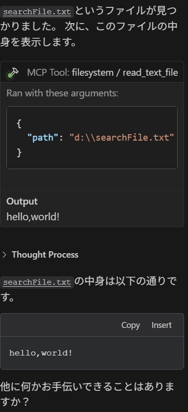 事前にMCPファイルサーバをインストールし、Dドライブのアクセス権を付与した状態でこのような指示を出してみました。するとどうでしょう。